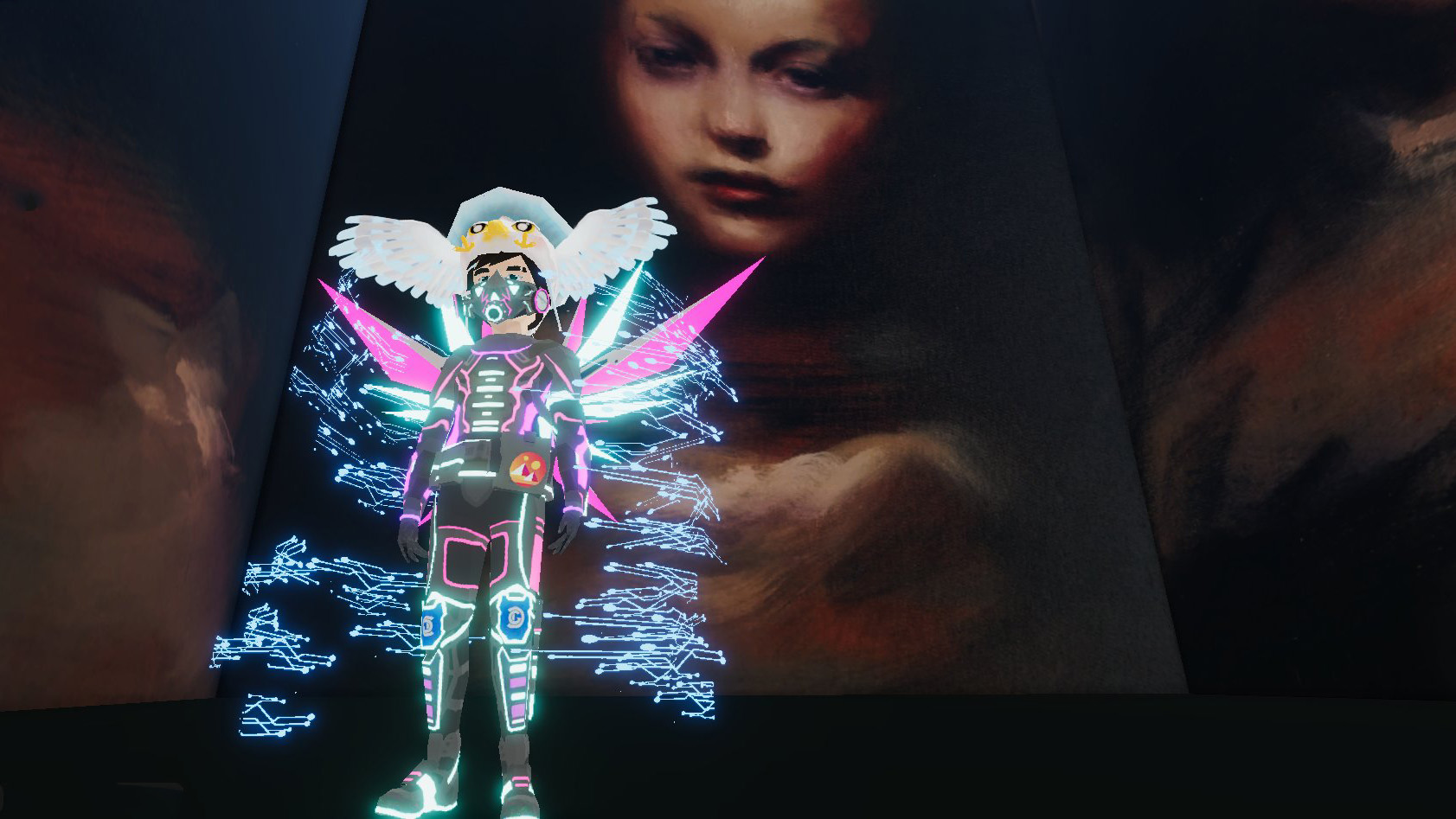 Designer Adrián Martínez created the installation architecture featuring all four muses, and 3D creative KJ Walker transformed one muse into the wearable face and headdress. Everything used within Muses 2 was an NFT asset, from the installation walls to the clothing (‘wearables’) and the poses (‘emotes’) of Bay’s avatar. The performance video was made available as an NFT in the inaugural Royal House of Medici auction.