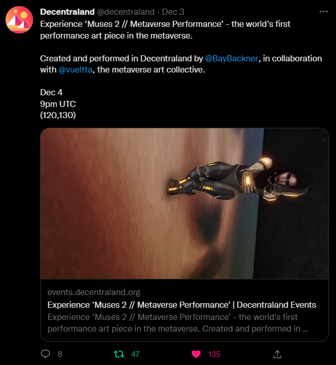 Bay and the Vueltta team confirmed with the Decentraland Foundation that no previous performance pieces had taken place in this metaverse. As Decentraland is the only metaverse in which artists can currently create art-led spaces, use their own bespoke emotes and wearables, and host public events, we believe that this makes Muses 2 the first in any metaverse.