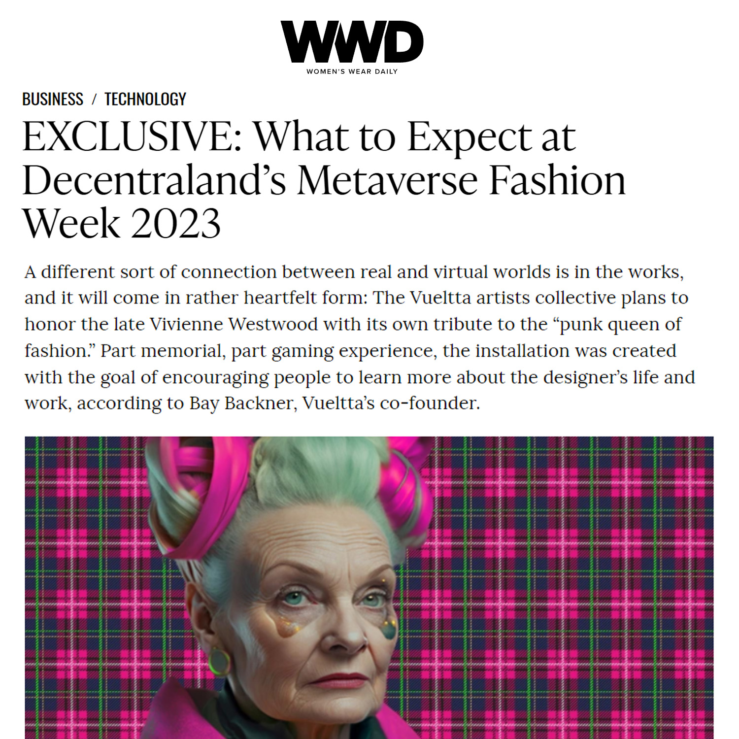 Bay was interviewed by Women’s Wear Daily reporter Adriana Lee about her work for Metaverse Fashion Week 2023. Bay introduced ‘Dear Vivienne’, the installation and game Bay is creating with art colletive Vueltta on the life and work of Vivienne Westwood.