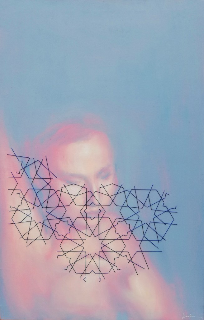 Arc (2019) – Oil paint, fluorescent pigment and embroidery on canvas