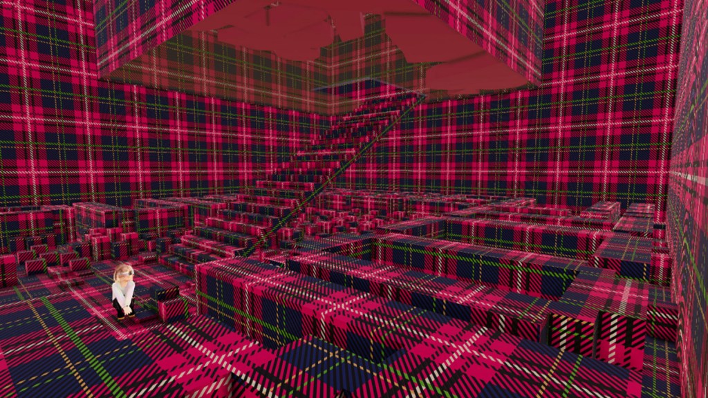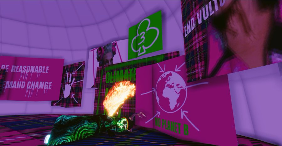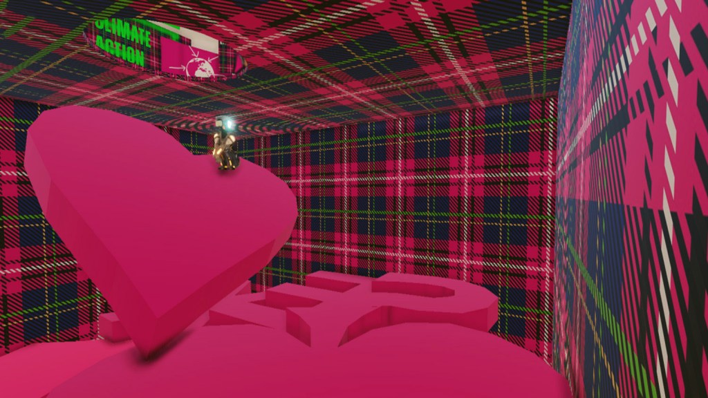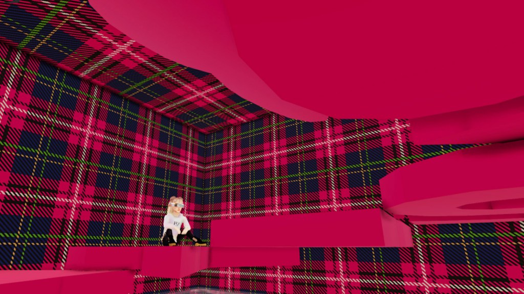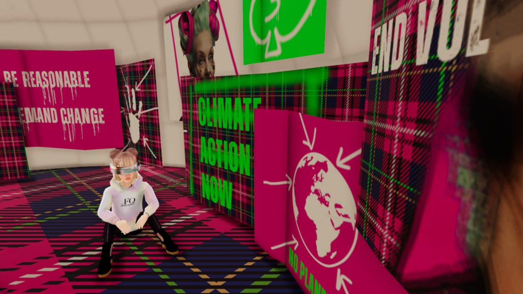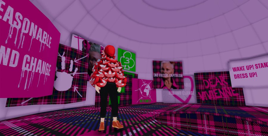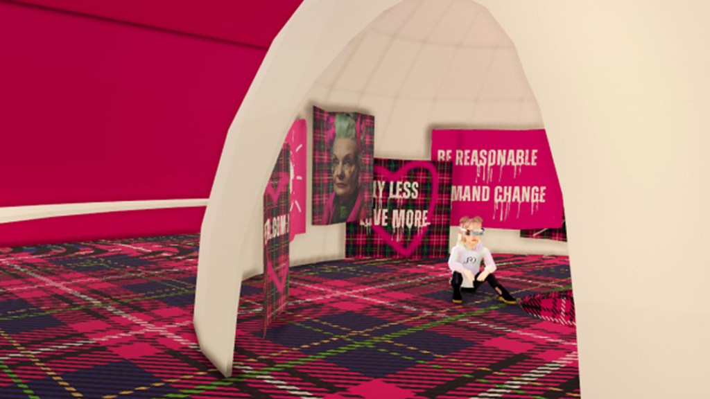 The installation had three floors: the ground floor focused on Dame Vivienne’s story through the game; the second introduced some of the key visual elements to her work; and the third featured her environmental activism and a circular catwalk – on which Vueltta hosted an ‘Anti-Fashion Catwalk’ for the Decentraland community.