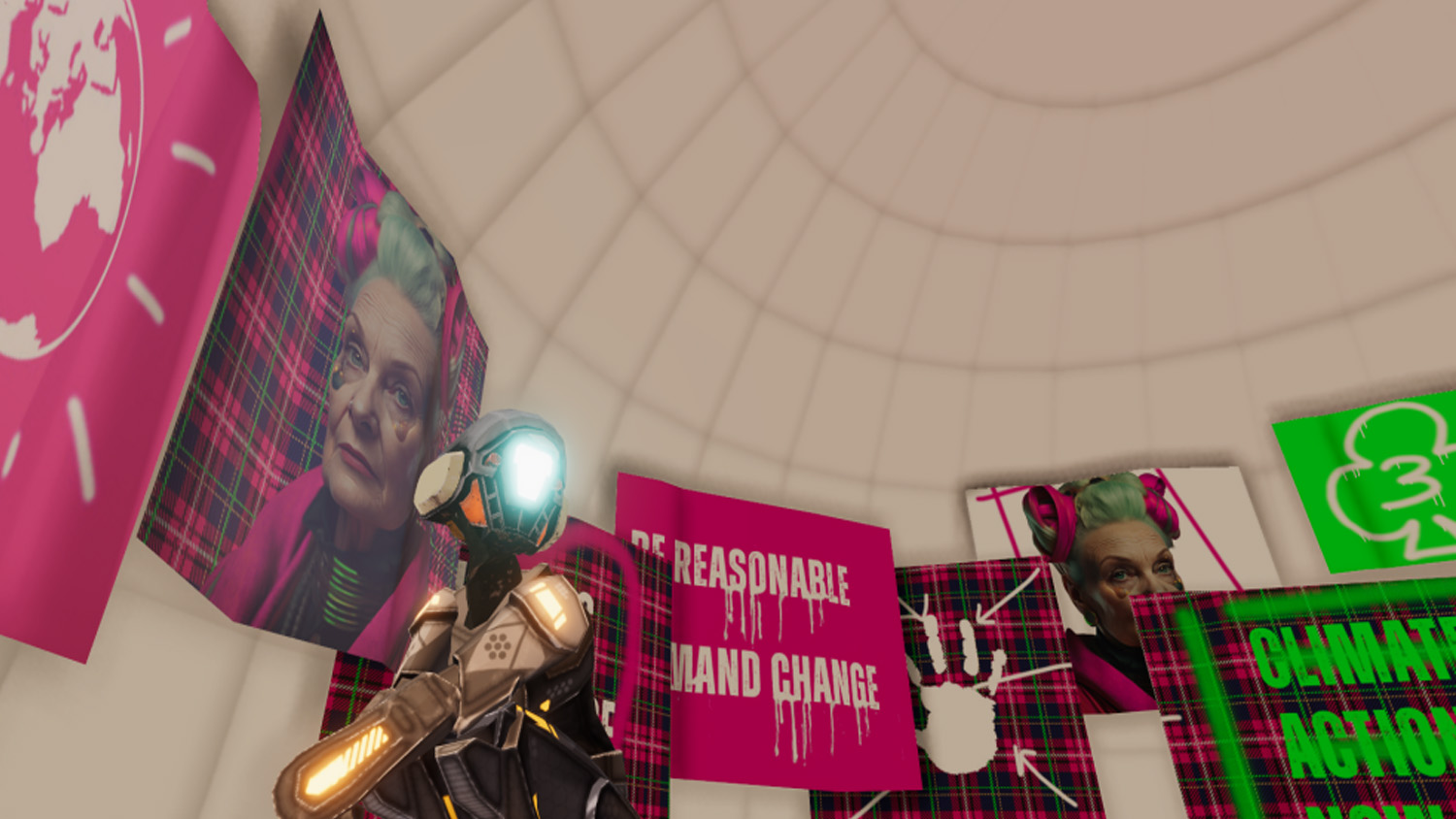 The installation had three floors: the ground floor focused on Dame Vivienne’s story through the game; the second introduced some of the key visual elements to her work; and the third featured her environmental activism and a circular catwalk – on which Vueltta hosted an ‘Anti-Fashion Catwalk’ for the Decentraland community.