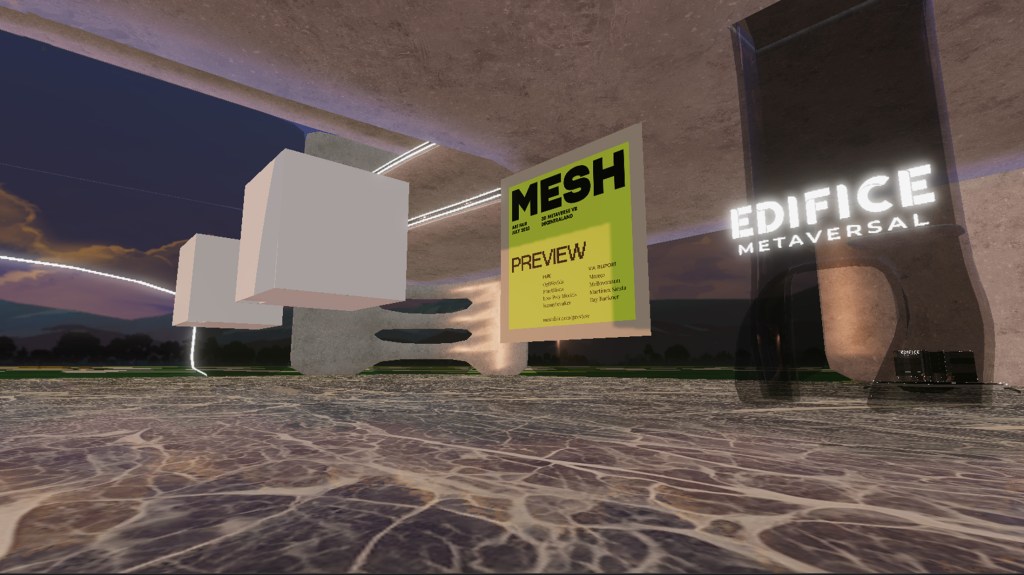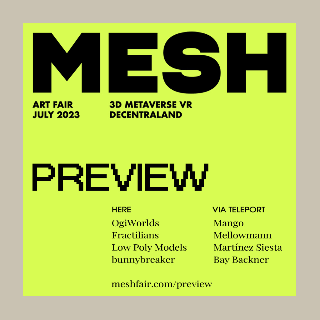 MESH Preview was created as a community “teaser” of what’s to come at the MESH art fair in July 2023. At MESH Preview, Decentraland visitors could explore eight new immersive artworks by leading 3D creators. The artwork was presented in eight floating cubes, all with secrets and surprises inside.